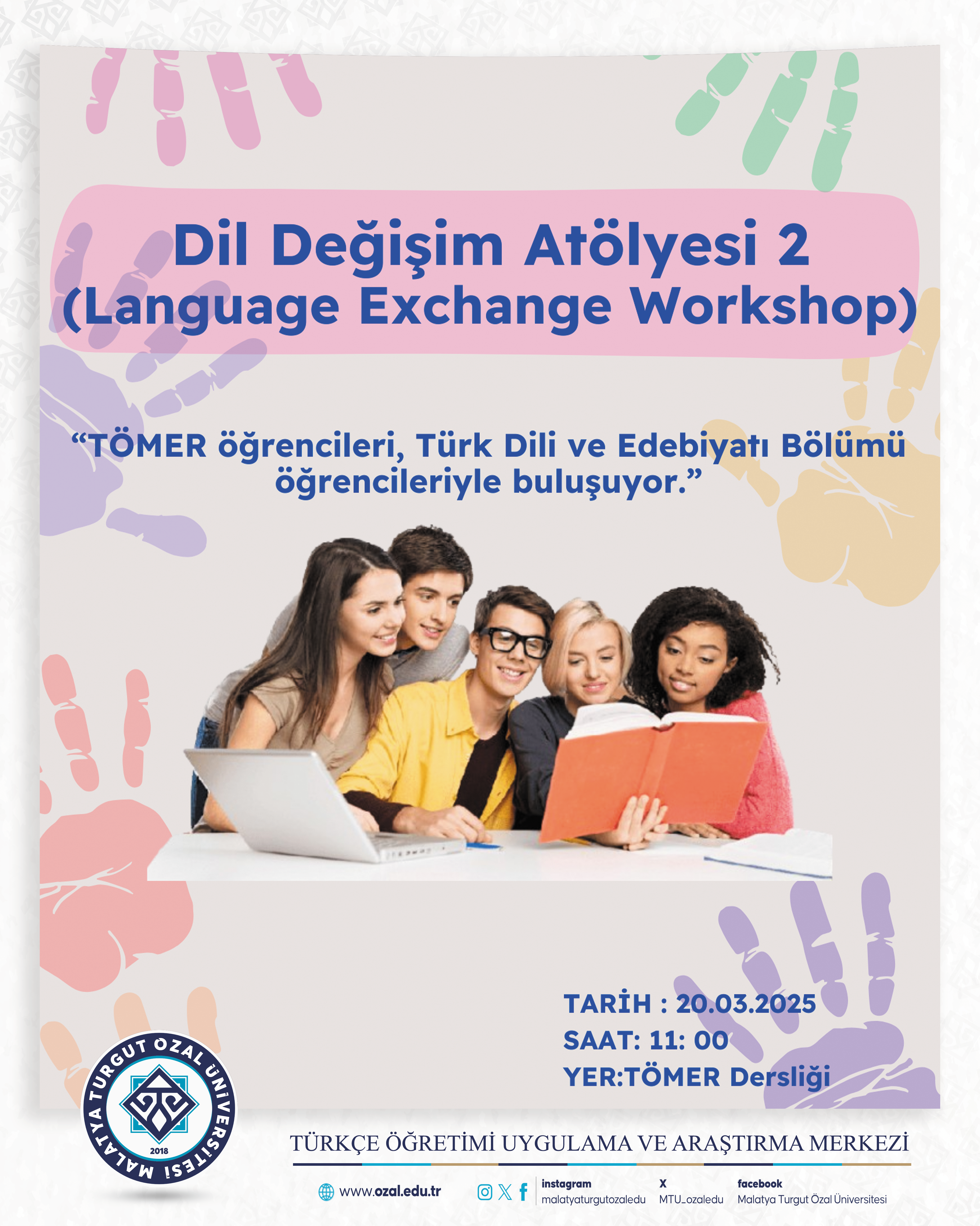 Malatya Turgut Özal Üniversitesi Türkçe Öğretimi Uygulama ve Araştırma Merkezi (TÖMER) olarak, Türk Dili ve Edebiyatı Bölümü öğrencileriyle TÖMER öğrencilerini bir araya getireceğimiz Dil Değişim Atölyesi 2 etkinliğini düzenliyoruz.